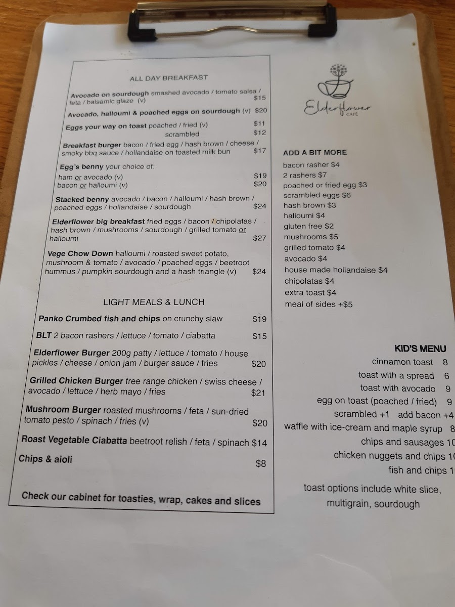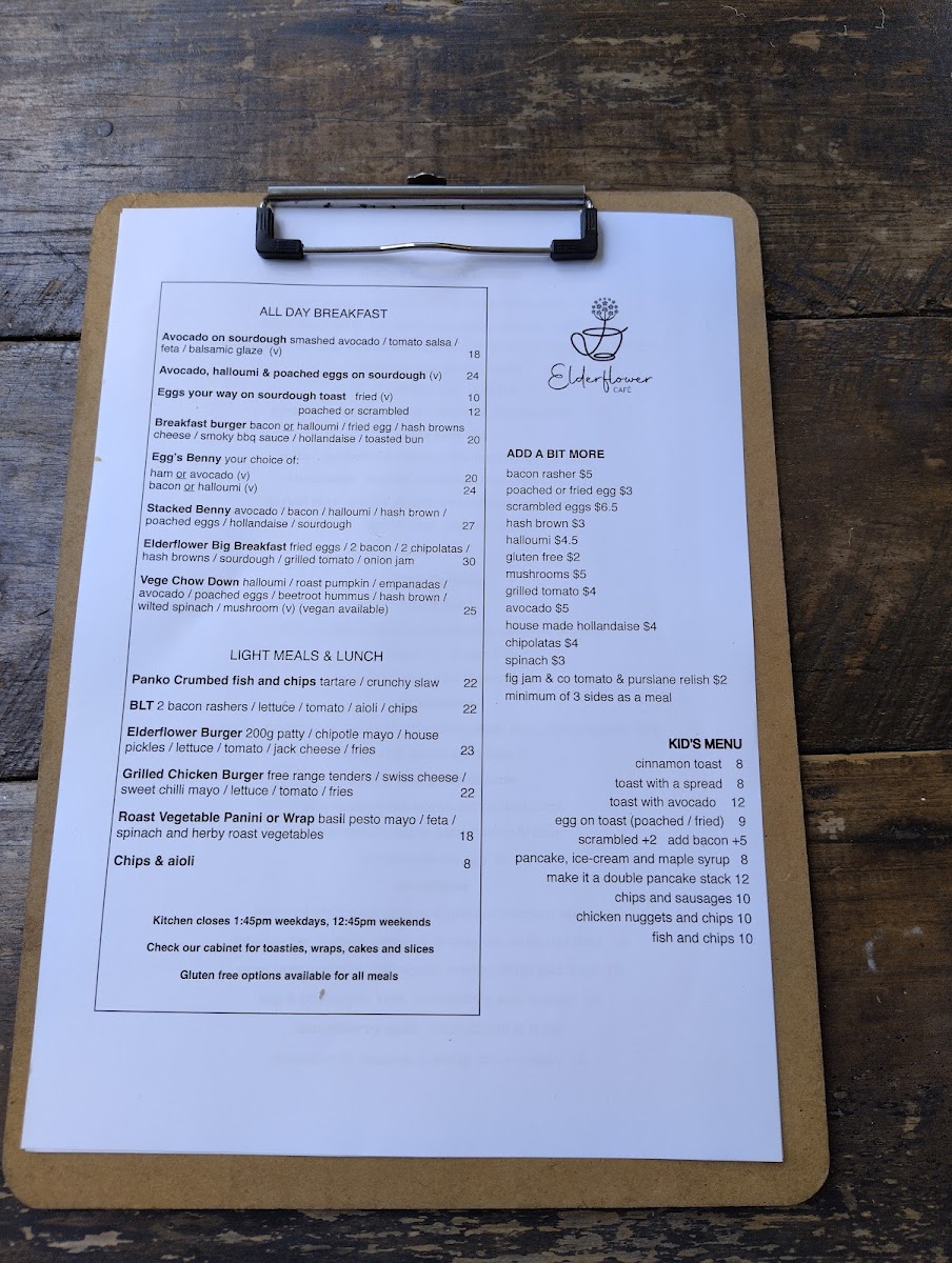 For lunch, the café caters to all tastes with its selection of light meals. The Panko Crumbed Fish and Chips ($22) is a local favorite, perfectly crispy and always cooked to perfection. Meat lovers will appreciate the scrumptious Elderflower Burger ($23), while vegetarians can delight in the roasted flavors of the Roast Vegetable Panini ($18). Children are also well-catered to with a kid's menu featuring favorites like Pancake, Ice Cream and Maple Syrup for just $8.